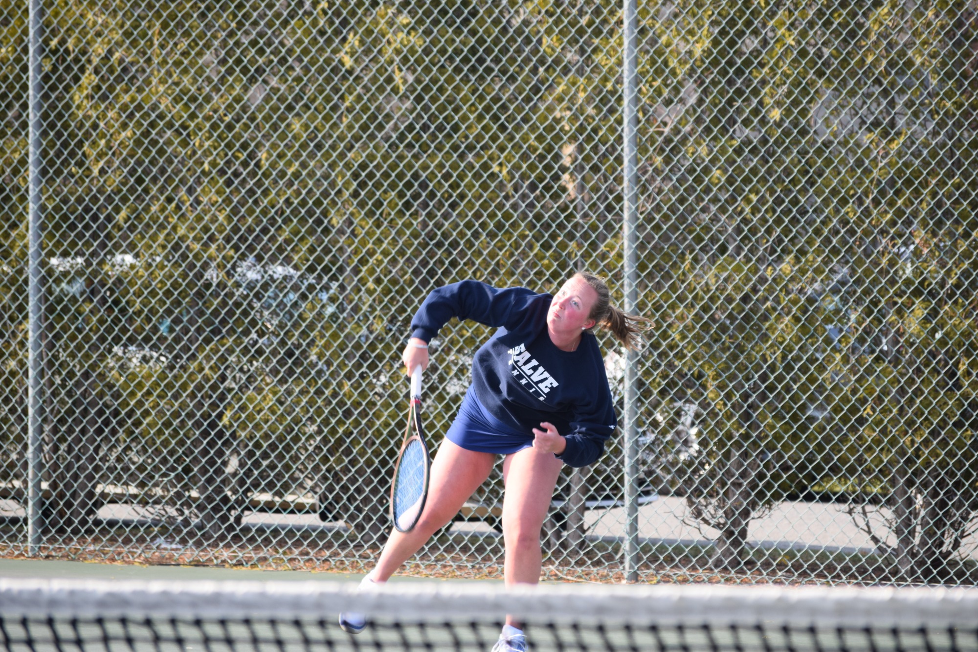 Salve Regina senior Graysen Scherer (Mystic, Conn.) combined with first year Kaydin Pinto (Acushnet, Mass.) to record an 8-5 result at number three doubles over the home team's tandem of West and sophomore Haylee Doiron (Lowell, Mass.).